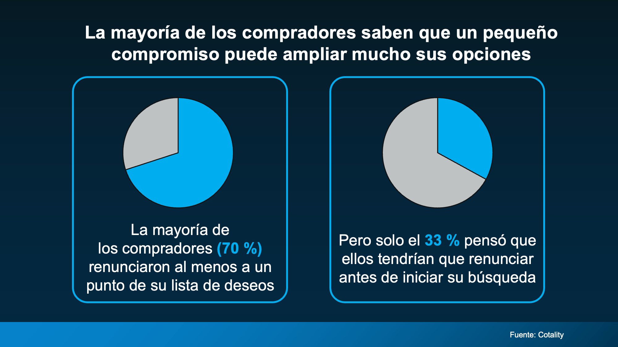 Los datos muestran que cada vez más compradores utilizan esa estrategia para compensar los obstáculos de la asequibilidad en el mercado actual. Un estudio reciente de Cotality encontró que la mayoría de los compradores (70 %) acabaron renunciando a uno o más artículos de su lista original de deseos. Pero antes de empezar a buscar, solo el 33 % esperaba renunciar todo el tiempo: